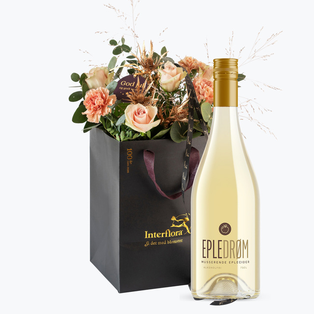 En fin harmonisk blomstrende bukett i lyse delikate toner som leveres i Interfloras eksklusive gavepose. Si det med blomster! Leveres med en flaske deilig musserende cider med smak av eple.